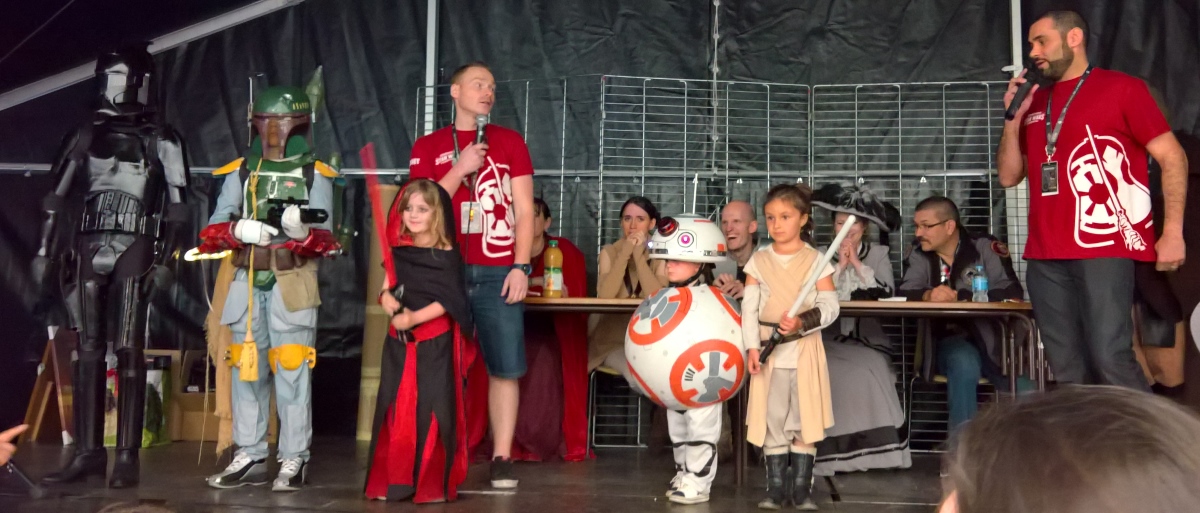 Après l’habituelle délibération du jury (qui a permis à nos animateurs de rappeler les actions caritatives de la convention), les trois finalistes ont été annoncés : Tout d’abord les grands gaillards Marius et Léo en Boba Fett et Clone trooper noir puis l’adorable Sith Katelyn et enfin la fratrie Gabin et Aimy en BB-8 et Rey. Gabin avait fait fureur auprès du public avec son BB-8 sonore et surtout en faisant disparaître sa tête pour reproduire encore mieux le droïde.
