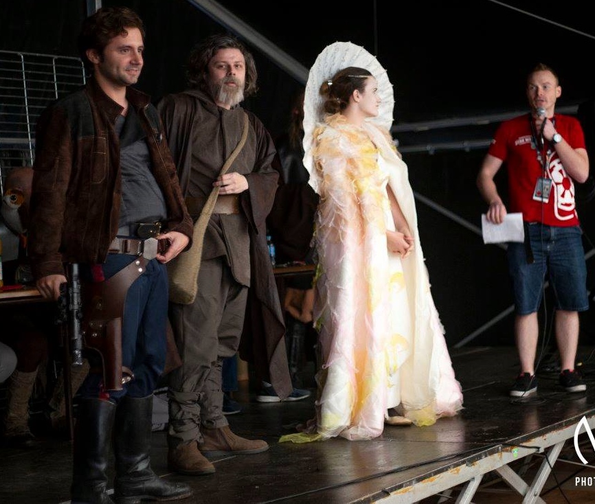 Ensuite, n’ayant pas d’écran publicitaire à passer pour ménager le suspens, les trois finalistes étaient désignés : Geoffrey, le spoiler vivant en Han Solo version du prochain Solo: A Star Wars Story, Clément en Old Luke (Star Wars VIII) et Elise, la seconde Padmé robe de parade de la journée. A noter que Clément et Elise ont marqué nos animateurs : Padmé étant monté sur l’estrade juste après que Luke ait renversé son lait vert, sa robe fut jugée très pratique pour nettoyer le sol et éviter des chutes de concurrents !