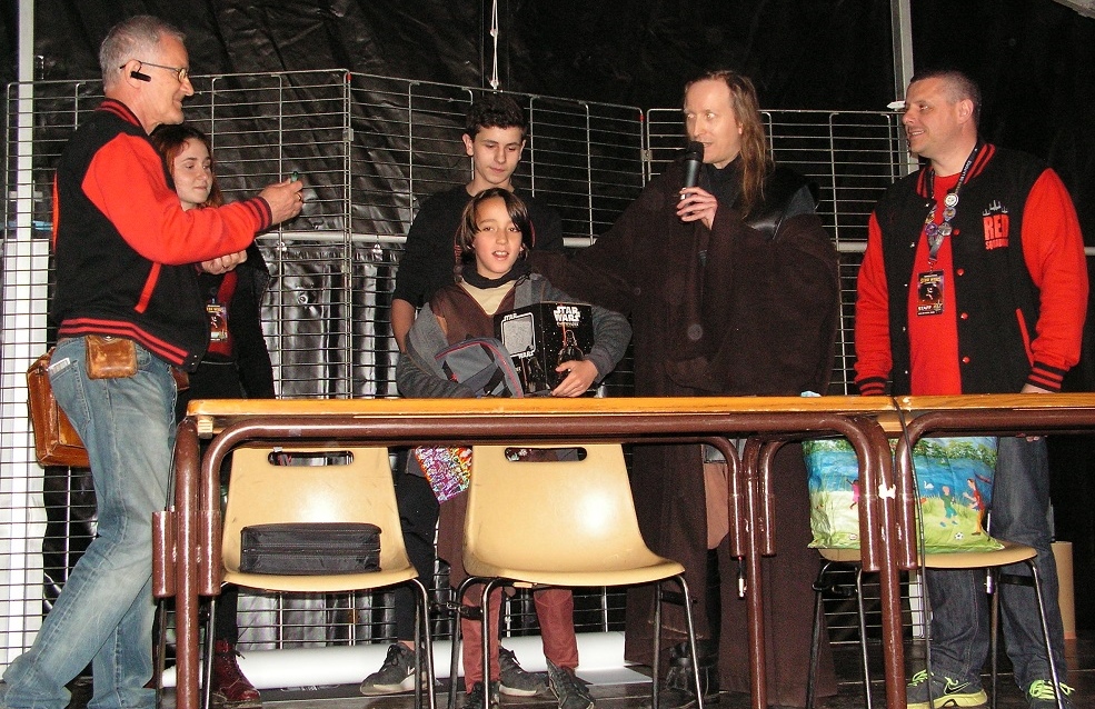 Félicitation au jeune gagnant : Melvil, 11 ans et venu de Lyon, a su répondre à tous les pièges concoctés par le maître de cérémonie Sébastien. Cette année, les questions tournaient principalement autour des personnages de la saga ! Les question de qualification pour la grande finale étaient d’ailleurs liées à nos acteurs invités cette année. Pour les curieux, les questions du concours Padawan sont disponibles en suivant ce lien vers notre forum.