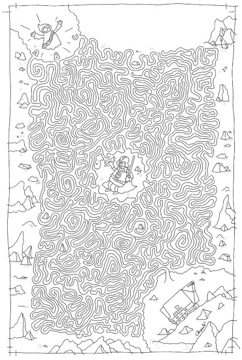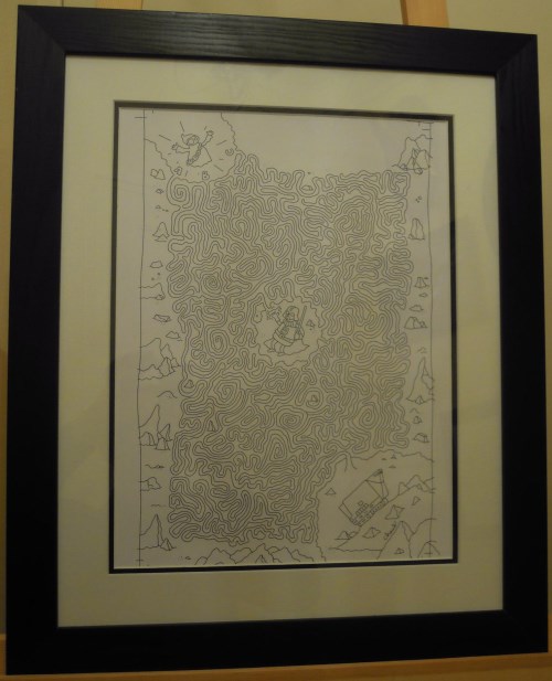 La deuxième pièce est d’une grande originalité et est réalisée par Jérôme Schirtzinger dit « Cheub », illustrateur vichyssois spécialisé dans l’imagerie pour enfants. Coutumier de la réalisation de labyrinthes diaboliques dans des livres de jeux, Cheub a mis en situation un Jawa pour qui le destin pourrait devenir bien sombre ! Vous aurez l’occasion de voir ce labyrinthe mis en couleurs dans un autre cadre lors de notre convention… Mais pour l’instant vous n’en saurez pas plus.