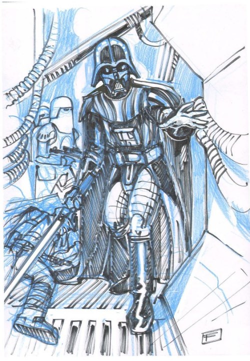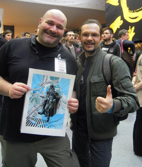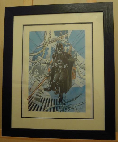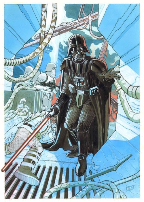 La première est réalisée par le toujours souriant Davide Fabbri, illustrateur italien de comics de très grand talent ! C’est l’arrivée du Seigneur des Sith sur la base Echo de Hoth que Davide a voulu immortaliser à sa façon. Une pièce unique car Davide a réalisé ici une mise en couleurs « traditionnelle », ce qu’il fait maintenant rarement. Ce fut pour lui un travail de plusieurs jours et le résultat est vraiment impressionnant… Mais certes probablement pas du goût des rebelles !