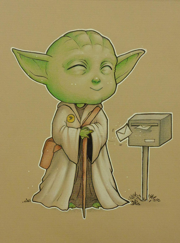 Pour finir en beauté ce concours en partenariat avec la Poste, les gagnants recevront également une carte exclusive reprenant au recto et au verso les dessins originaux que les Héritiers ont offert aux responsables de la Poste à l’origine ce partenariat qui nous permet de vous couvrir de cadeaux. Ashline, illustratrice de talent que vous avez pu rencontrer à Générations Star Wars et SF cette année, a revisité pour l’occasion le célèbre Seigneur Sith et Maître Yoda !