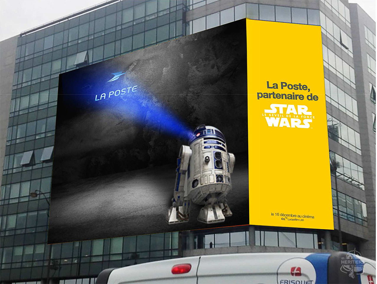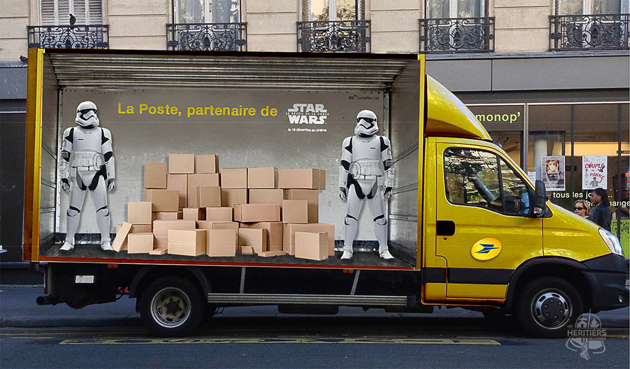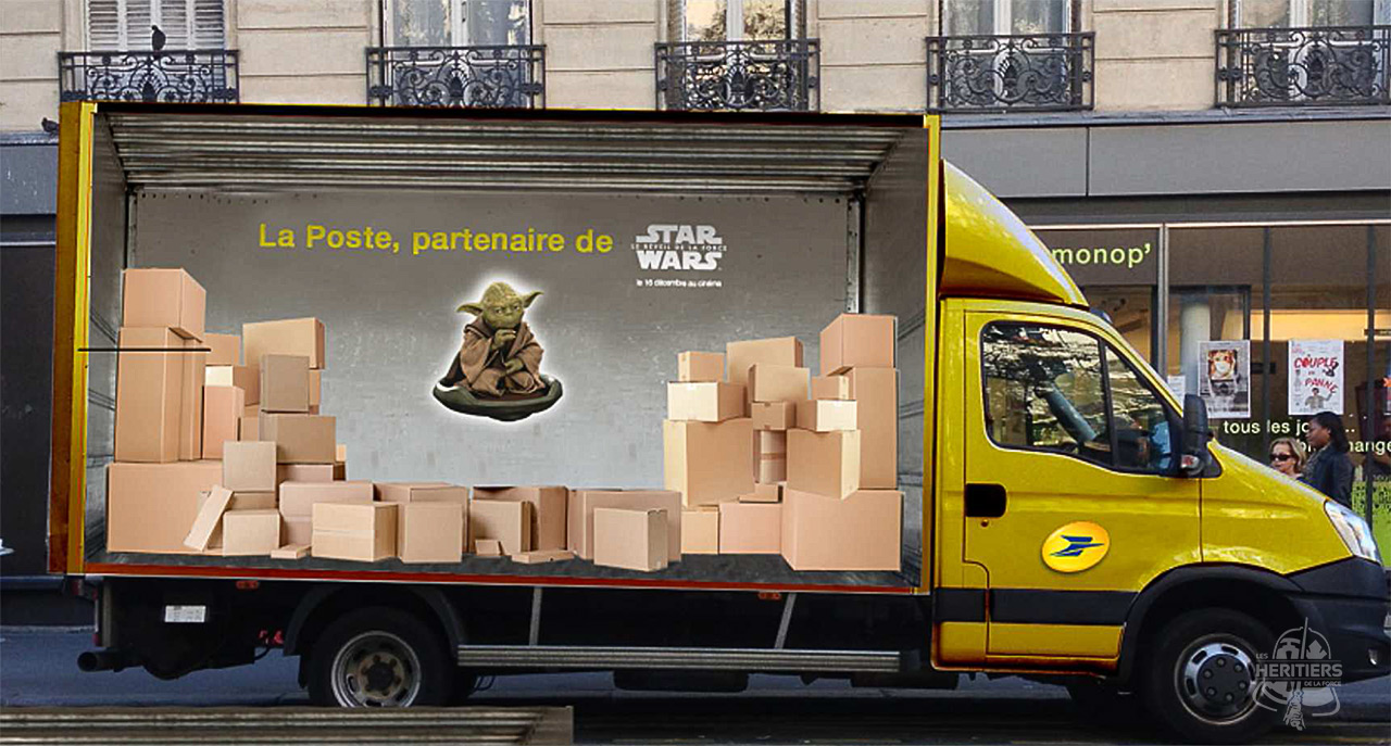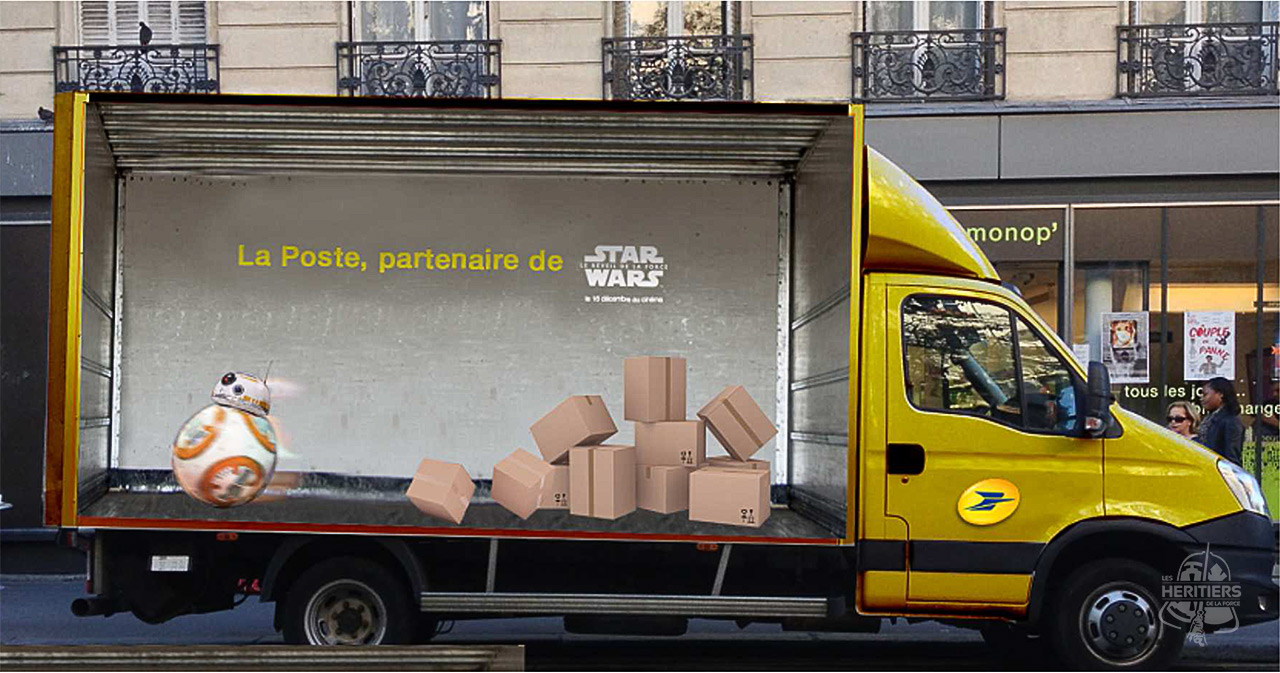 Et le bouquet final, parce que la Force est vraiment avec la Poste cette année, est la campagne d’affichage extraordinaire qui va commencer le 12 novembre prochain ! En effet, des affiches superbes sur les murs et des autocollants géants sur les camions ou camionnettes vont fleurir dans toute la France. Les parisiens auront même la chance de poster leur courrier dans trois modèles de boîtes aux lettres sonores à l’effigie de R2-D2, des Ewoks mais aussi de la célèbre navette Tydirium ! Et bien évidemment de nombreux visuels et PLV seront présents dans les bureaux de poste… A vous de juger à travers les photos ci dessous. Impressionnant, très impressionnant !!!