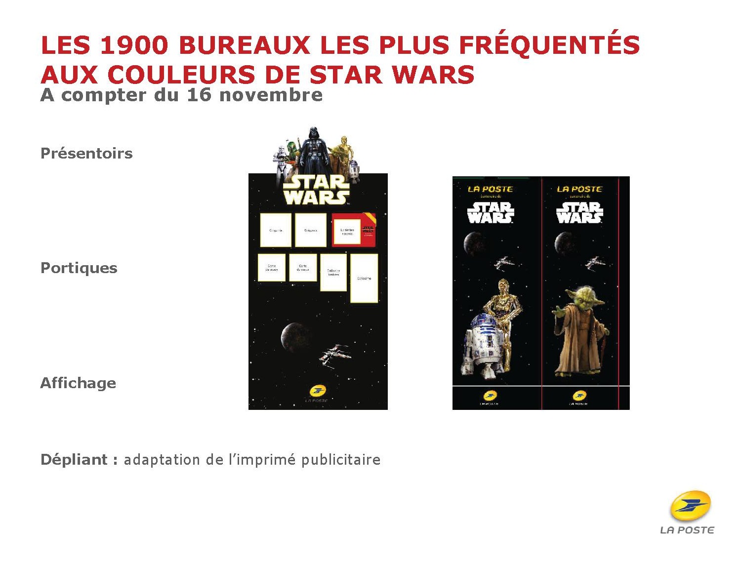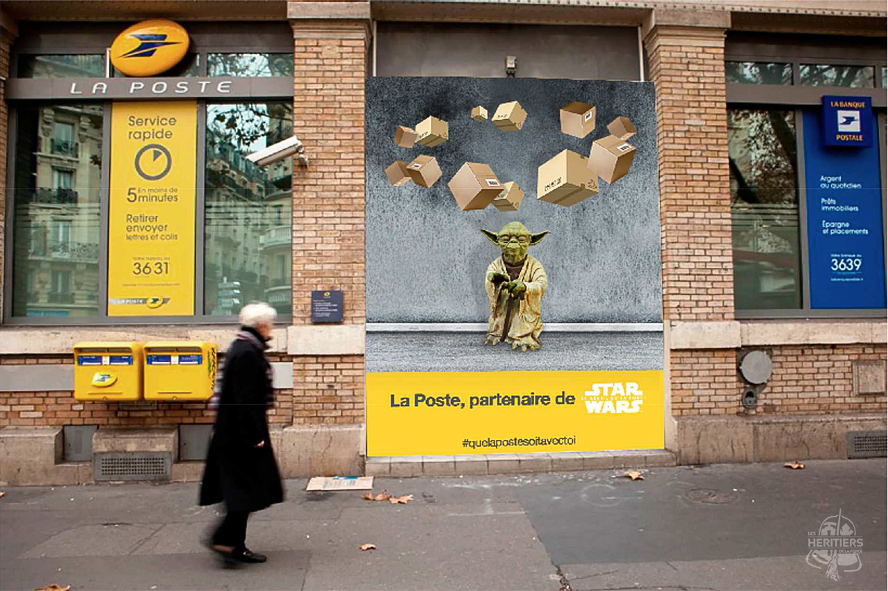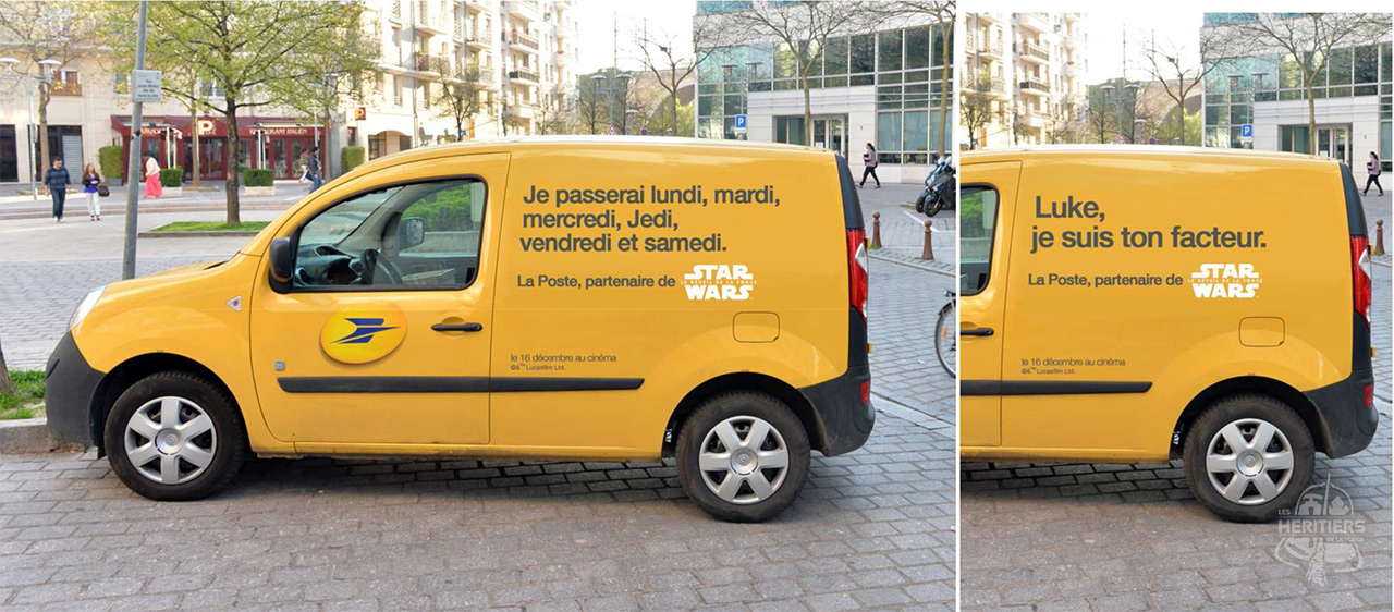 Et le bouquet final, parce que la Force est vraiment avec la Poste cette année, est la campagne d’affichage extraordinaire qui va commencer le 12 novembre prochain ! En effet, des affiches superbes sur les murs et des autocollants géants sur les camions ou camionnettes vont fleurir dans toute la France. Les parisiens auront même la chance de poster leur courrier dans trois modèles de boîtes aux lettres sonores à l’effigie de R2-D2, des Ewoks mais aussi de la célèbre navette Tydirium ! Et bien évidemment de nombreux visuels et PLV seront présents dans les bureaux de poste… A vous de juger à travers les photos ci dessous. Impressionnant, très impressionnant !!!