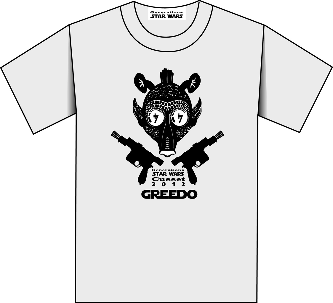 Enfin sachez aussi que les Héritiers de la Force mettront aussi des produits en vente à l’accueil puisque nous vous proposerons un t-shirt spécial Générations StarWars et Science Fiction 2012 en l’honneur de Greedo pour le prix de 12€ ainsi que 3 badges différents aux couleurs de l’association et de notre salon, vendu 1€ pièce.