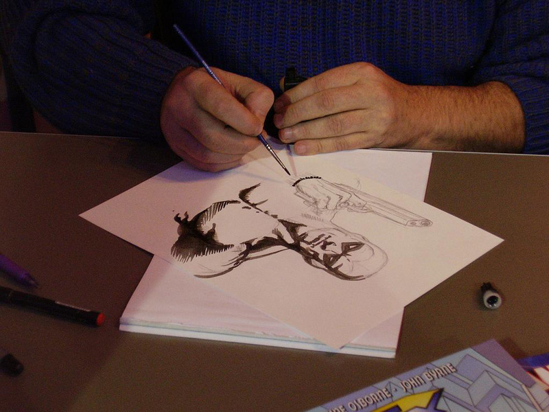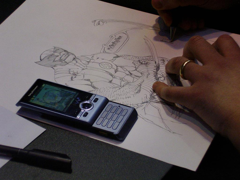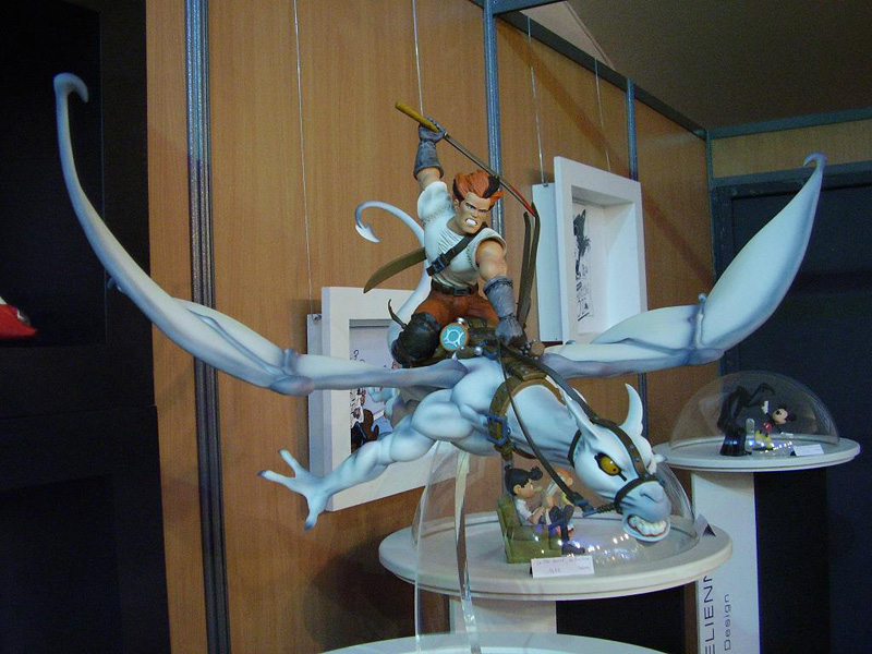 Ensuite, nous sommes évidemment aller aussi dire bonjour au staff Attakus toujours aussi sympa. C’est clair, le probe droid maintenant bien connu continu encore à faire autant d’effet aux visiteurs ! Attakus est aussi connu pour une série récente de sketchbooks permettant de feuilleter des carnets de croquis des meilleurs artistes de la bande dessinée et de l’illustration. Et comment ne pas profiter de l’occasion pour faire dédicacer le sketchbook d’Olivier Vatine, présent sur le stand Attakus. Je rappelle qu’il avait illustré avec Fred Blanchard la bd « l’Héritier de l’Empire » sortie en 3 volumes chez Dark Horse France en 1995. J’en ai donc profité pour me faire « croquer » Mara Jade, quel pied !