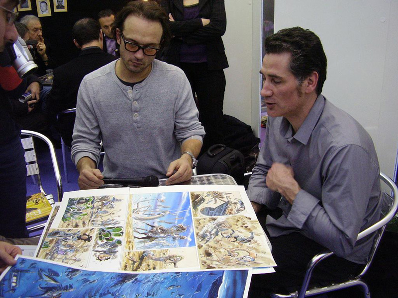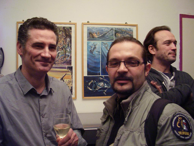 Le reste des 2 jours passés dans ce paradis, pour nous en tout cas, a été partagé entre les stands Panini, Soleil, Casterman, … mais sans oublier ceux des petites maisons d’éditions qui peuvent tout comme les grandes présenter de véritables petits trésors ! Et pour finir en beauté, avec un mélange de « coups de bols » et de « concours de circonstances », nous nous sommes retrouvés invités avec Greg au vernissage de l’illustrateur Tiburce Oger et du scénariste Vincent Perez (le même qu’au cinéma, oui, oui !) à découvrir des planches originales du 3 ème volume de leur excellente bd « La Forêt ». Grand moment aussi !