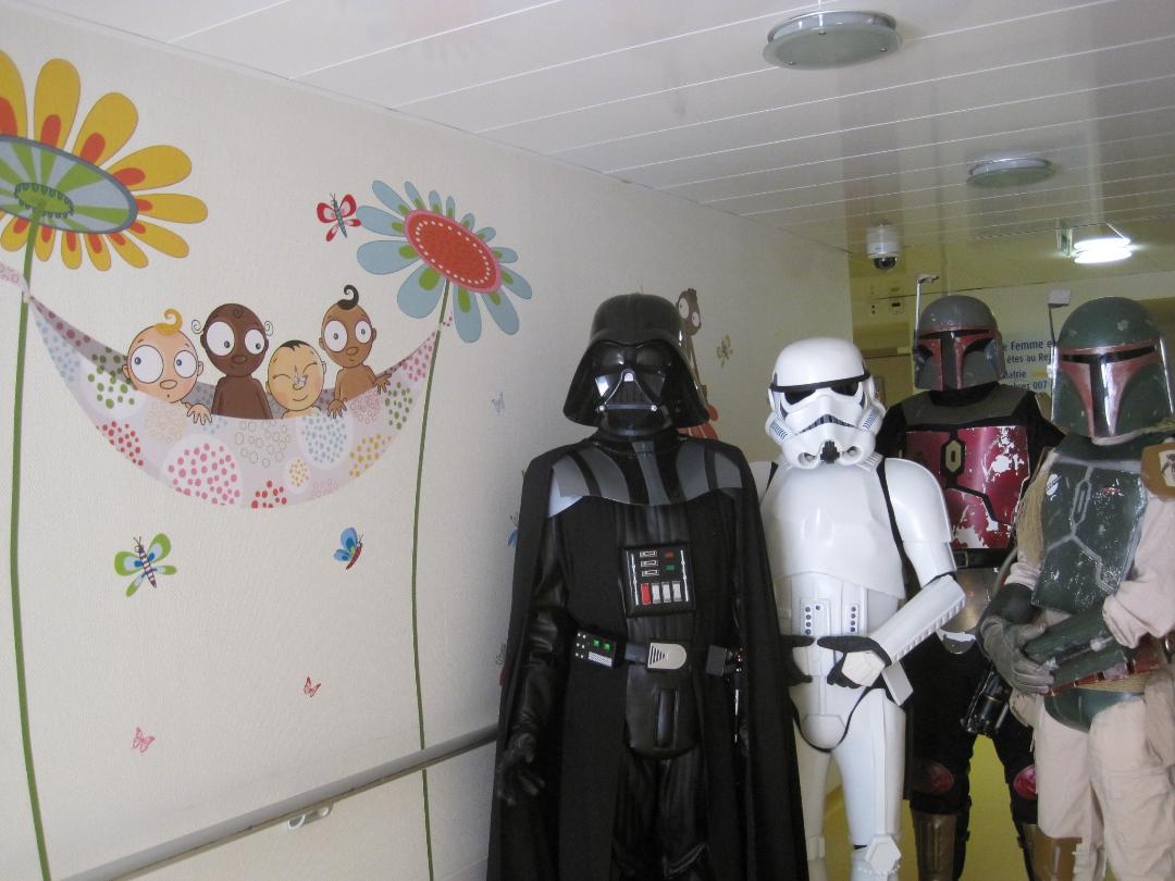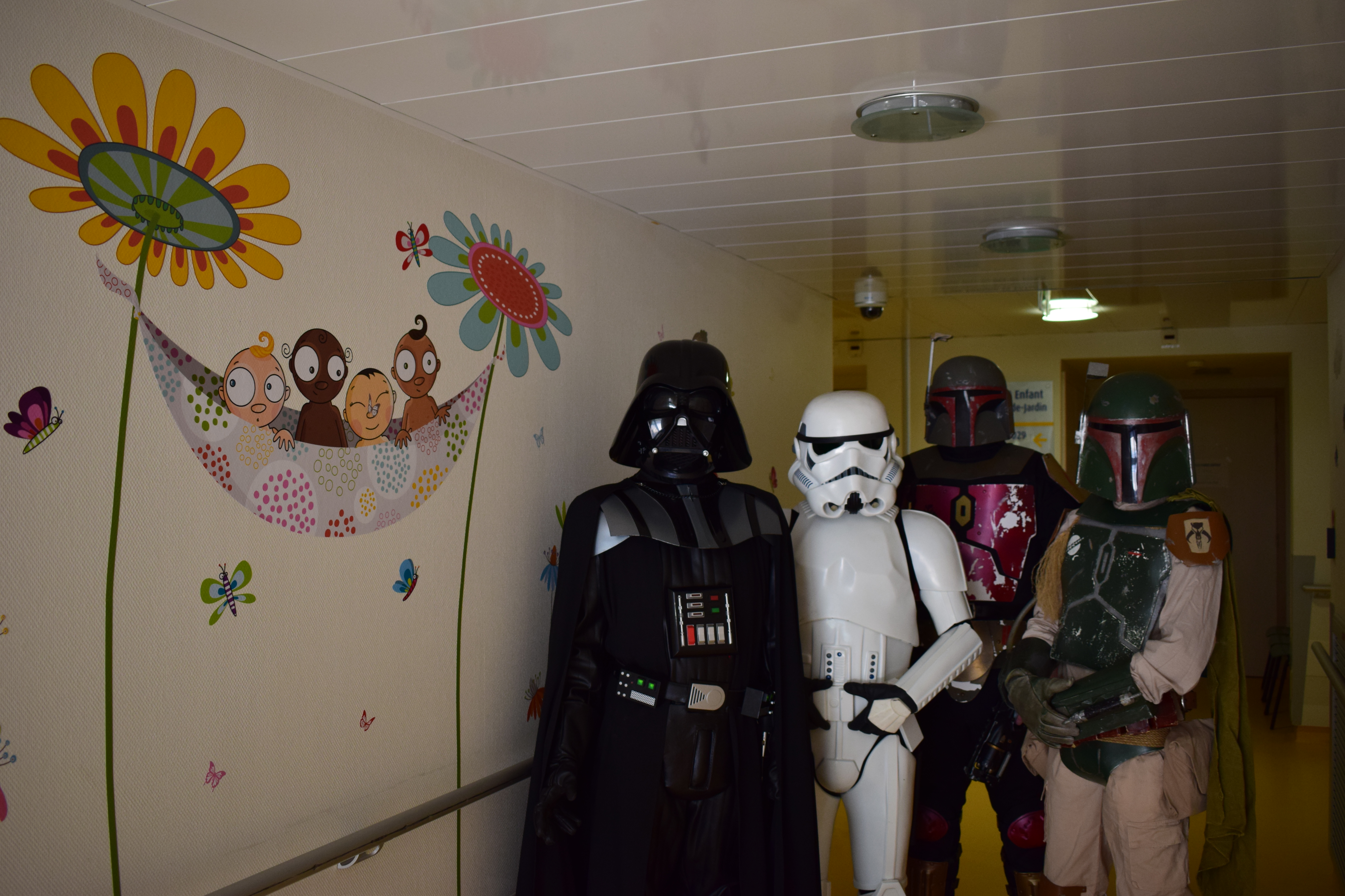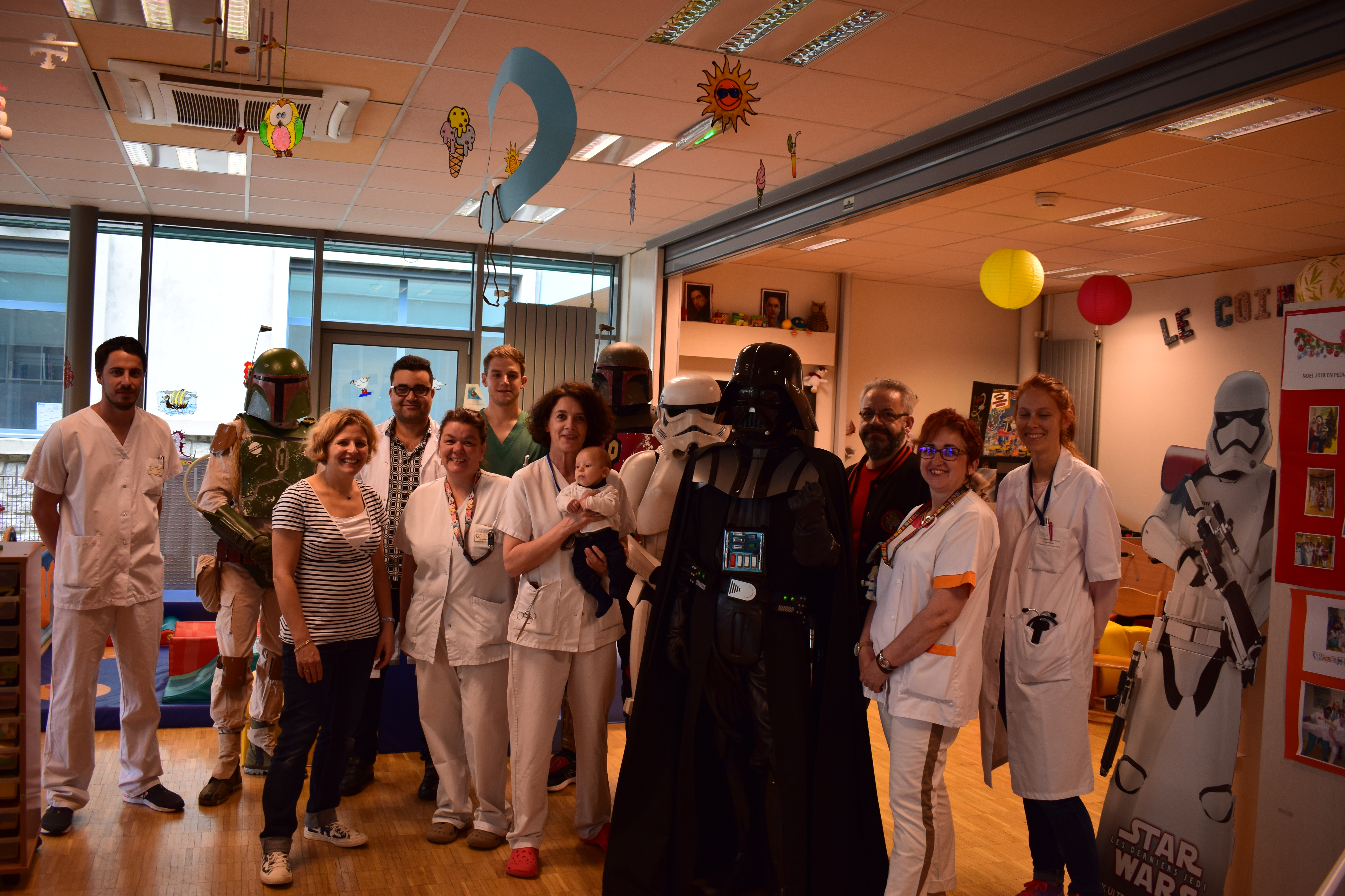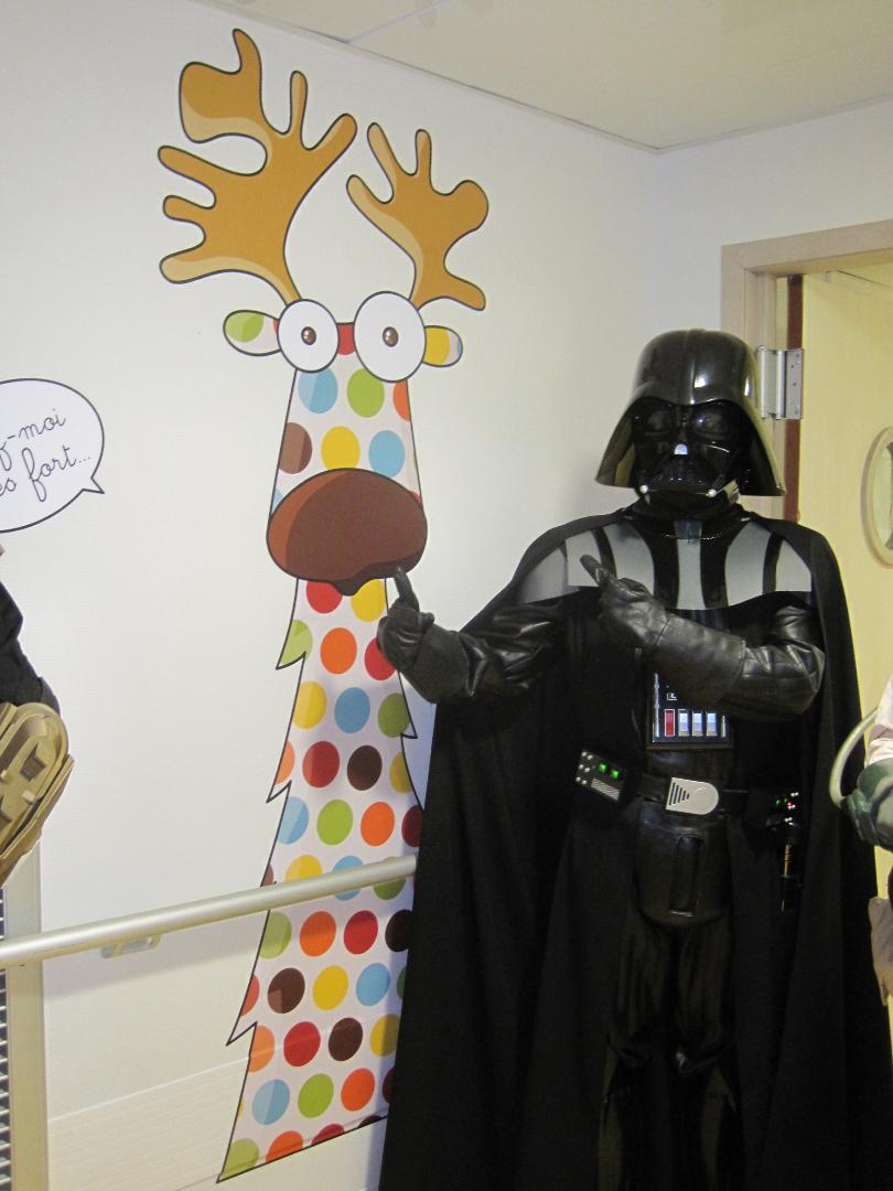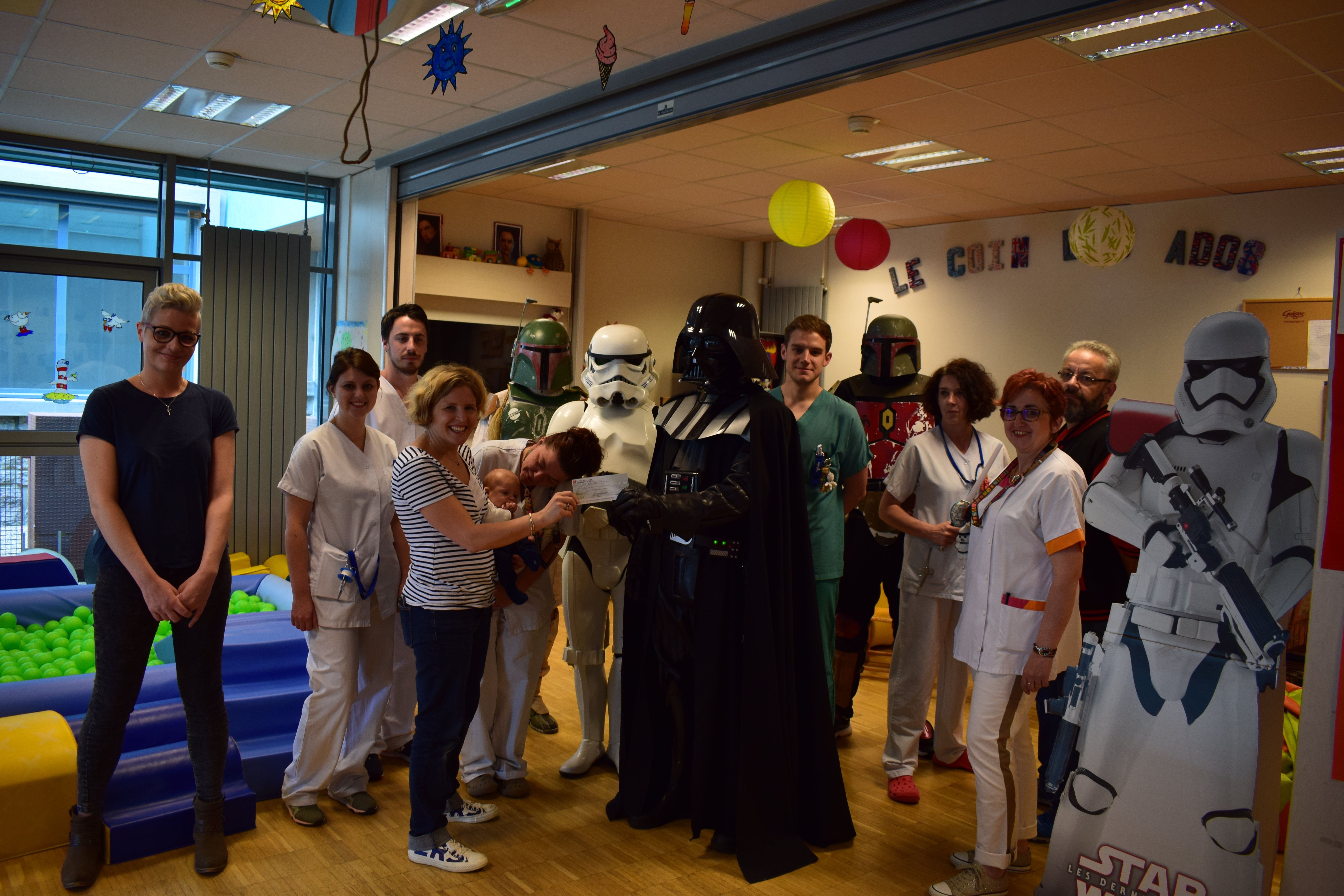 Comme vous le savez, notre action auprès du service pédiatrique de l’hôpital de Vichy ne se limite pas aux animations. Grâce aux dons récoltés lors des diverses actions durant Générations Star Wars et Science-Fiction, nous pouvons aider financièrement le service pour divers projets. Nous avons donc remis lors de cette animation un chèque de 2800€ au service pédiatrie. Les dons des années 2017 et 2018 ont contribué à créer un environnement ludique et coloré, composé d’animaux et de personnages aux grands yeux ronds afin de rendre chaleureux le service pédiatrie pour les petits comme pour les grands. Pour vous donner une idée du résultat, direction les photos ci-dessous ou le site de Série Golo qui a réalisé les décorations qui sont désormais dans les couloirs et chambres du service.