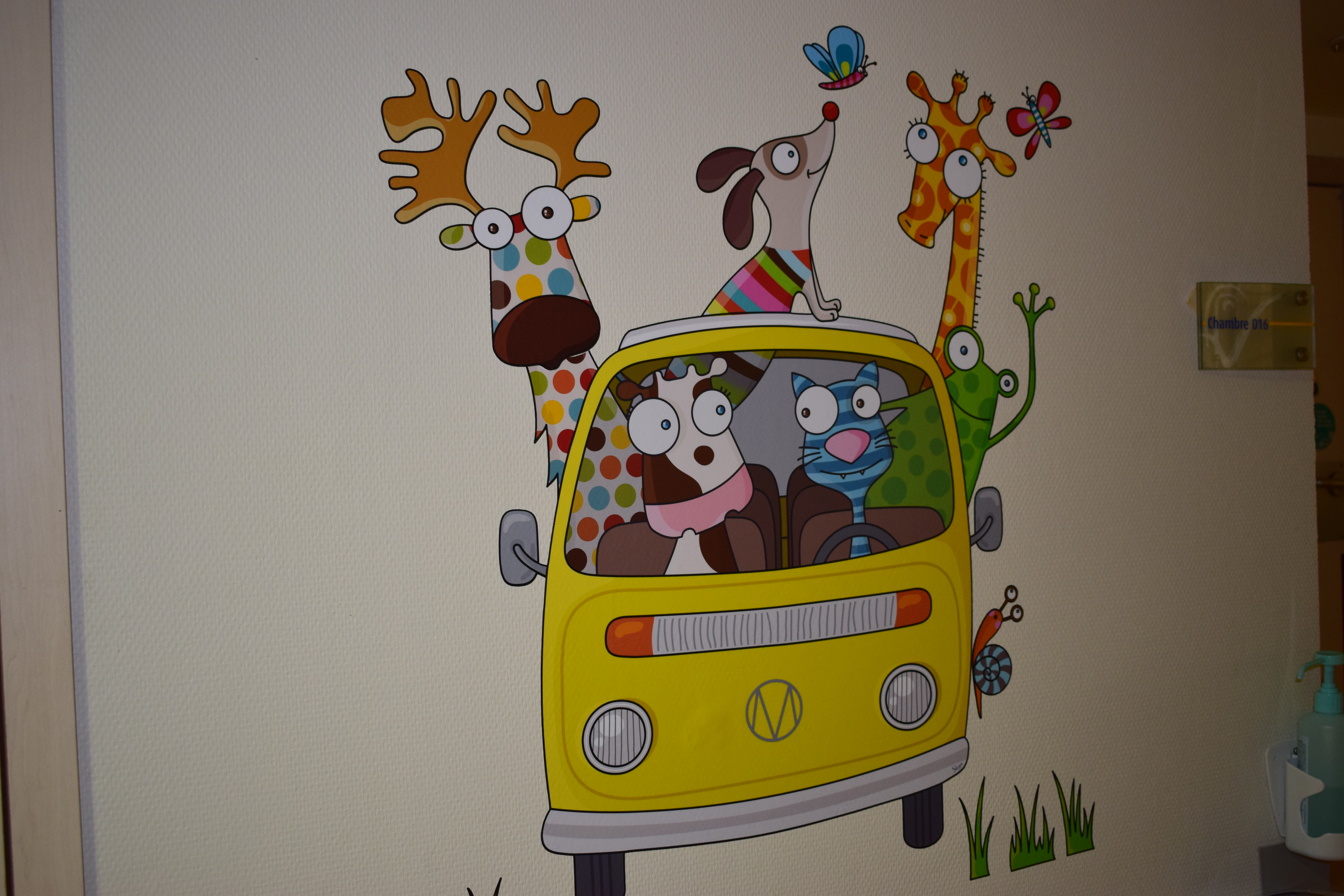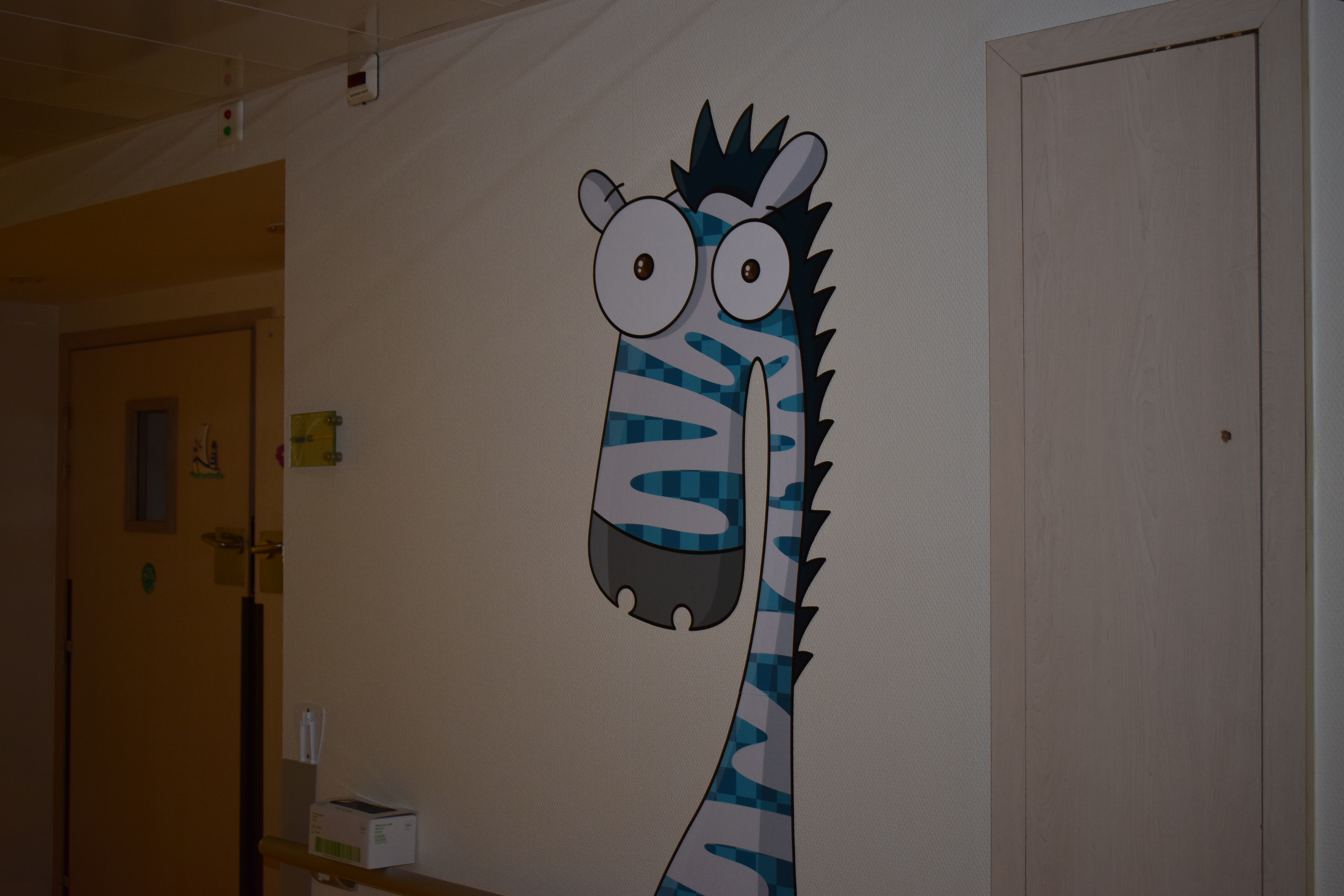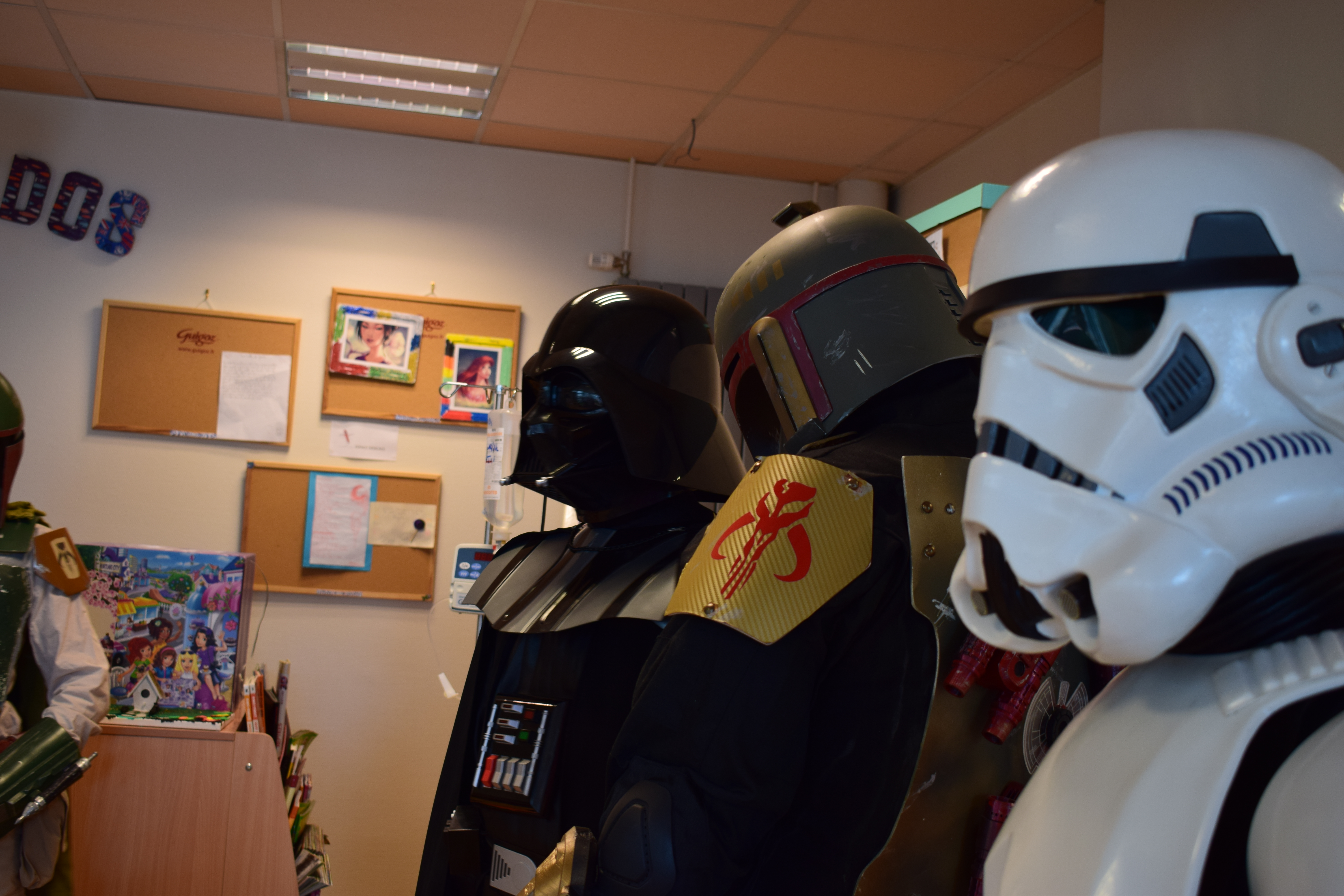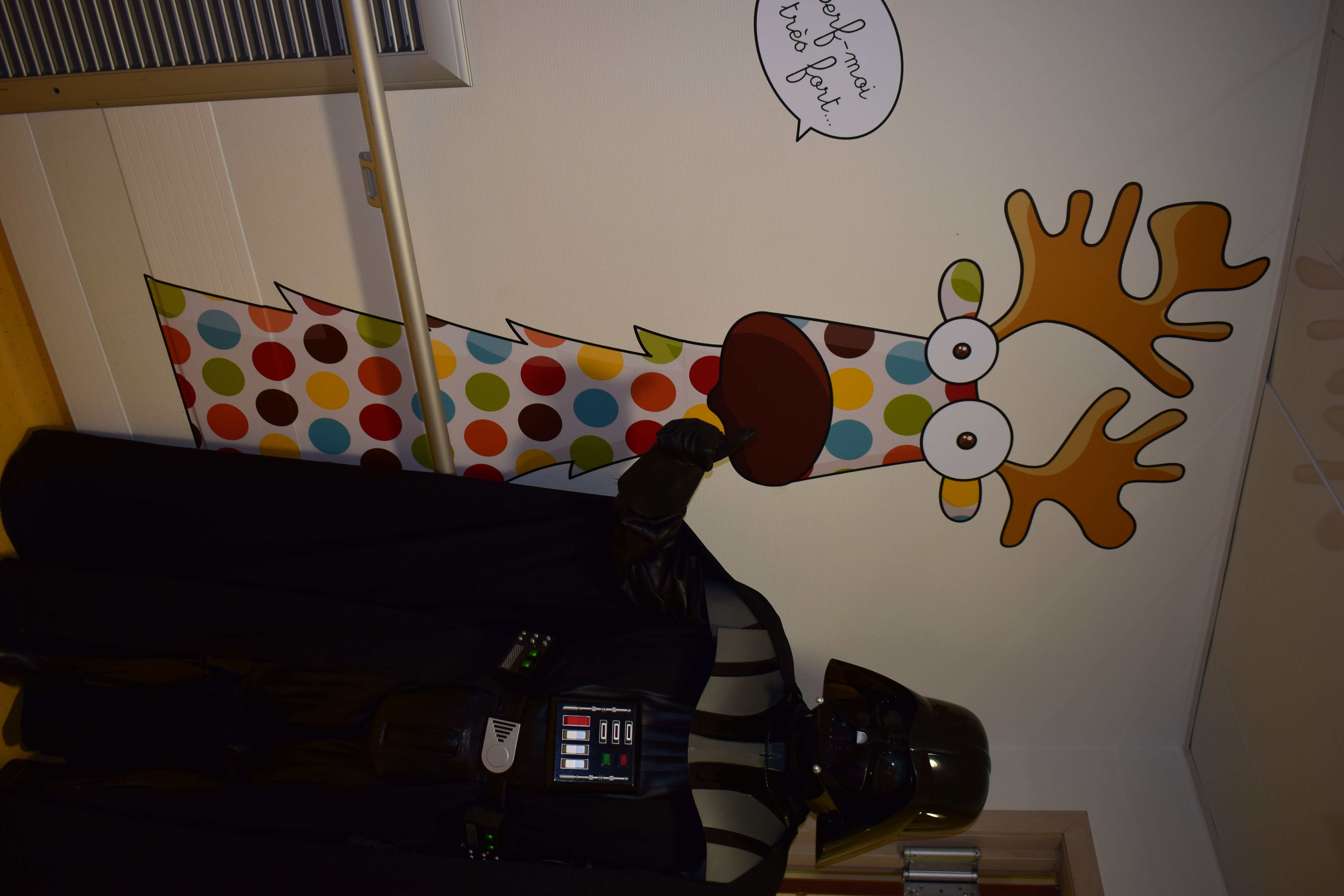 Comme vous le savez, notre action auprès du service pédiatrique de l’hôpital de Vichy ne se limite pas aux animations. Grâce aux dons récoltés lors des diverses actions durant Générations Star Wars et Science-Fiction, nous pouvons aider financièrement le service pour divers projets. Nous avons donc remis lors de cette animation un chèque de 2800€ au service pédiatrie. Les dons des années 2017 et 2018 ont contribué à créer un environnement ludique et coloré, composé d’animaux et de personnages aux grands yeux ronds afin de rendre chaleureux le service pédiatrie pour les petits comme pour les grands. Pour vous donner une idée du résultat, direction les photos ci-dessous ou le site de Série Golo qui a réalisé les décorations qui sont désormais dans les couloirs et chambres du service.