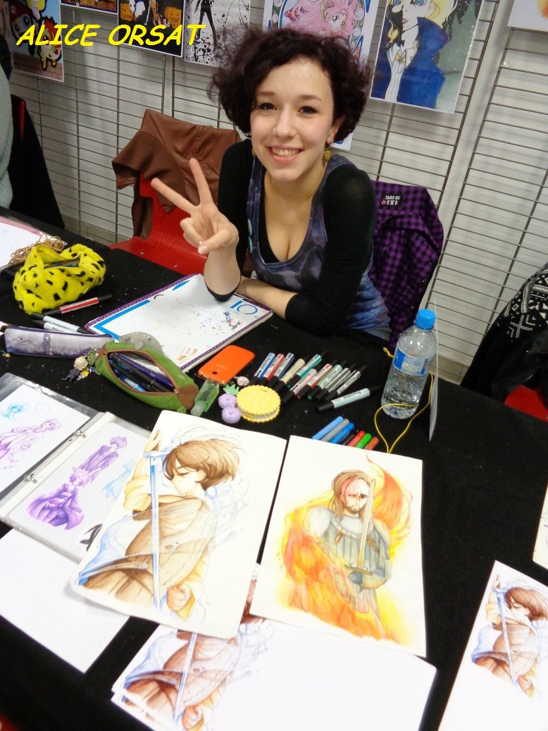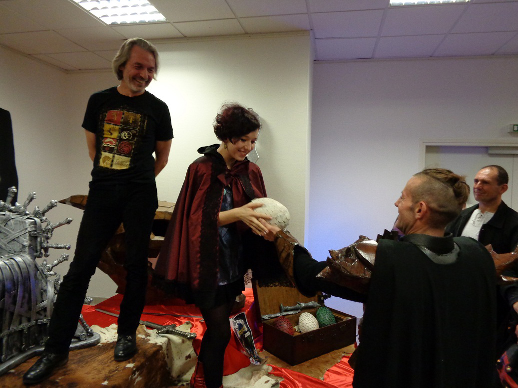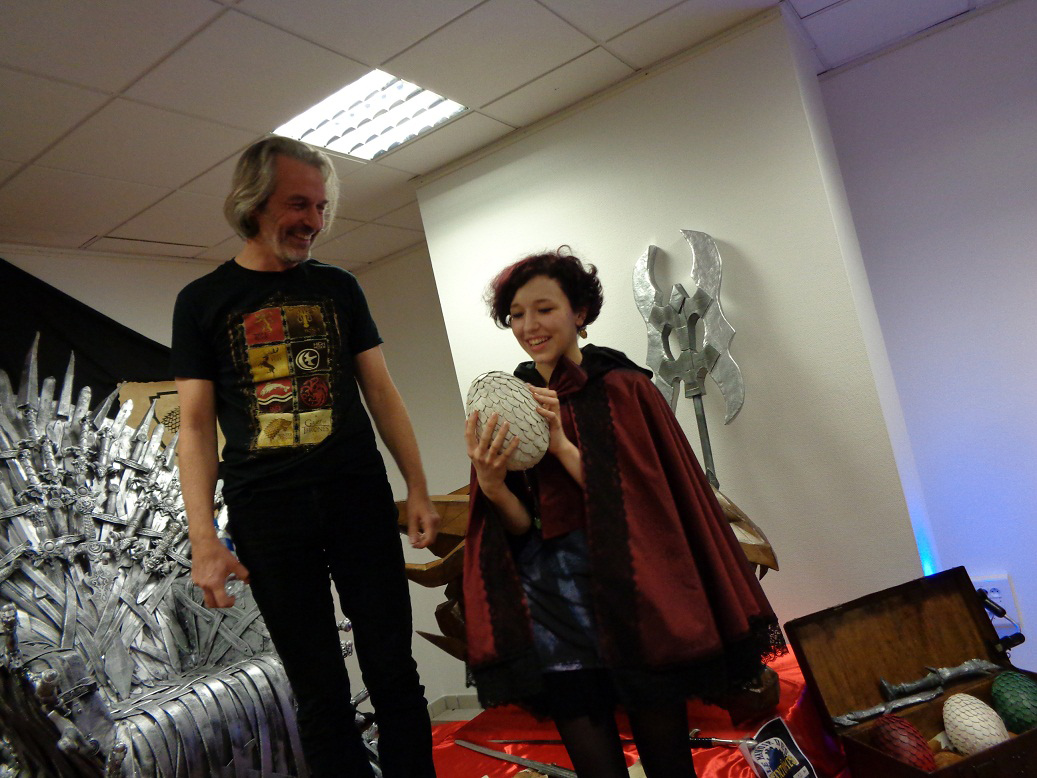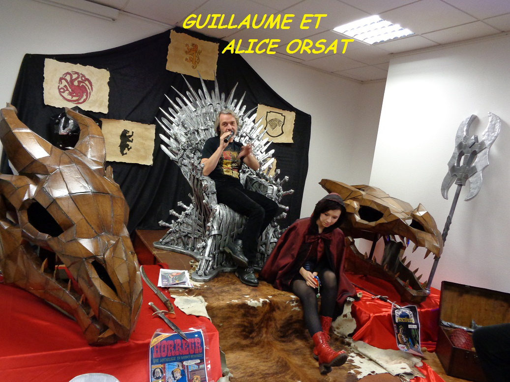 N  (1)Et puis, pour nombre de passionnés de Game Of Thrones, cette nouvelle édition était surtout l’occasion de rencontrer les acteurs de doublage français d’Arya, Alice Orsat, et du limier Sandor Clegane, Guillaume Orsat. Et non, pas d’erreur de frappe Guillaume et Alice sont bien père et fille, une relation qui créée un jeu d’acteur parfois amusant lors de leur doublage, comme ils ont pu l’expliquer longuement aux visiteurs lors de la conférence. Ces 2 artistes totalement adorables étaient d’une grande disponibilité à leur stand pour des échanges, des dédicaces et photos gratuites, vraiment une très belle rencontre à faire. En plus Alice est une  dessinatrice de talent, une occasion à saisir d’avoir un tirage de l’illustration exclusive d’Arya et du limier, illustration réalisée par Alice et signé par cet adorable duo, vraiment un superbe souvenir pour ceux qui l’on vécut !