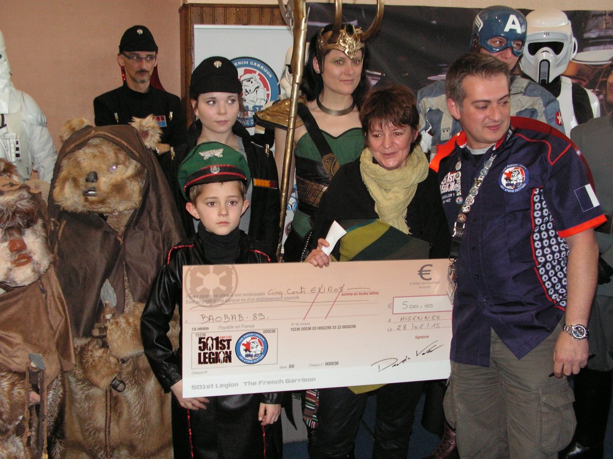 Star Wars n’était pas représenté que par notre association : La Rebel Legion et la 501 étaient là, avec leurs stands et leurs superbes costumes. Migennes fut aussi l’occasion pour la 501 de remettre un chèque de 500 euros à l’association Baobab 89 qui aide aux habitants du Burkina Faso en constatant les besoins réels sur place et en élaborant des projets avec les habitants. Encore une fois, la 501 prouve que derrière les habits austères de l’Empire se cachent un cœur d’or !